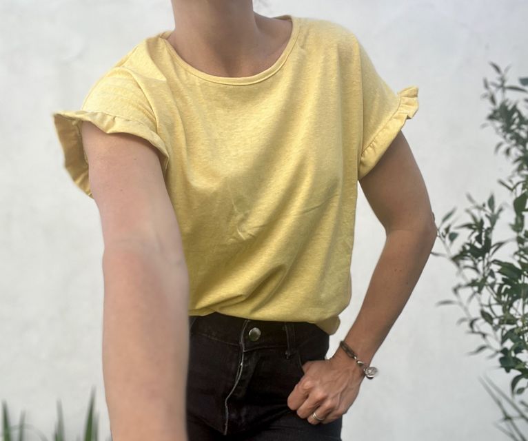 Remera de jersey de algodón peinado cuello redondo manga con volado de mujer.