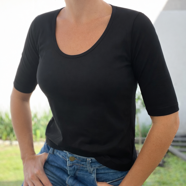 Remera de jersey de algodón peinado premium cuello redondo mangas 3/4 de mujer.